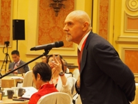 A delightful encounter with Prof. Gordon Melton after the speech 伍教授发表和谐神学后,美国宗教研究专家Gordon Melton教授提出发问,并十分欣赏伍教授用生动例子解释 |